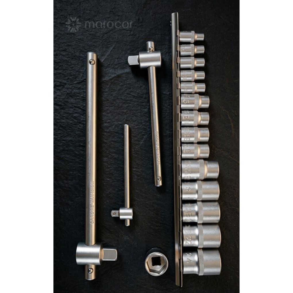 L'ensemble comprend une sélection minutieuse de douilles métriques de haute précision, soigneusement organisées sur un rail métallique pour un rangement optimal et un accès rapide. Ces douilles sont complétées par trois clés en T coulissantes de longueurs différentes. La conception coulissante de la poignée permet d'ajuster le bras de levier pour appliquer un couple de serrage puissant ou pour travailler rapidement dans des espaces restreints. Fabriqué en acier Chrome-Vanadium forgé et traité thermiquement, ce kit garantit une résistance supérieure à la torsion et à la corrosion. La finition mate satinée offre une excellente prise en main, même avec des mains grasses.