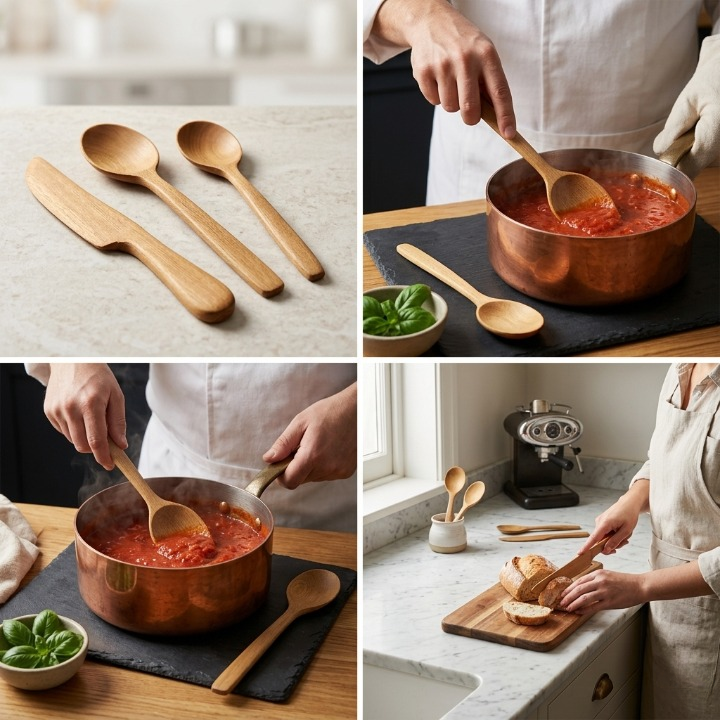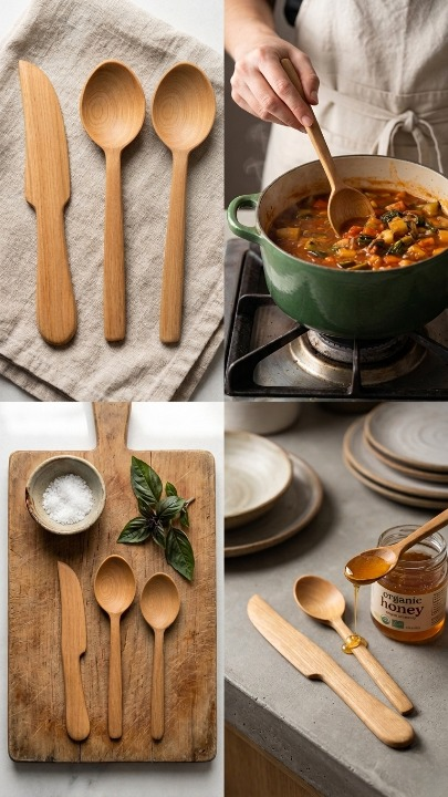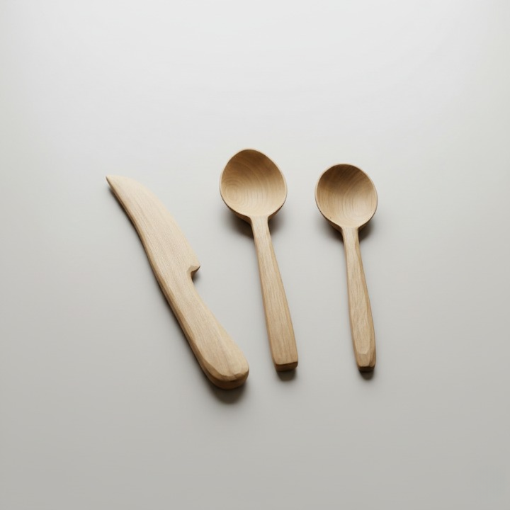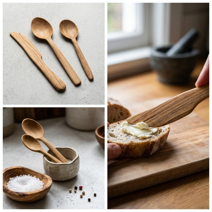 Ensemble d’ustensiles en bois de thuya composé de deux cuillères et d’un couteau, idéal pour un usage quotidien en cuisine avec un style naturel et traditionnel.