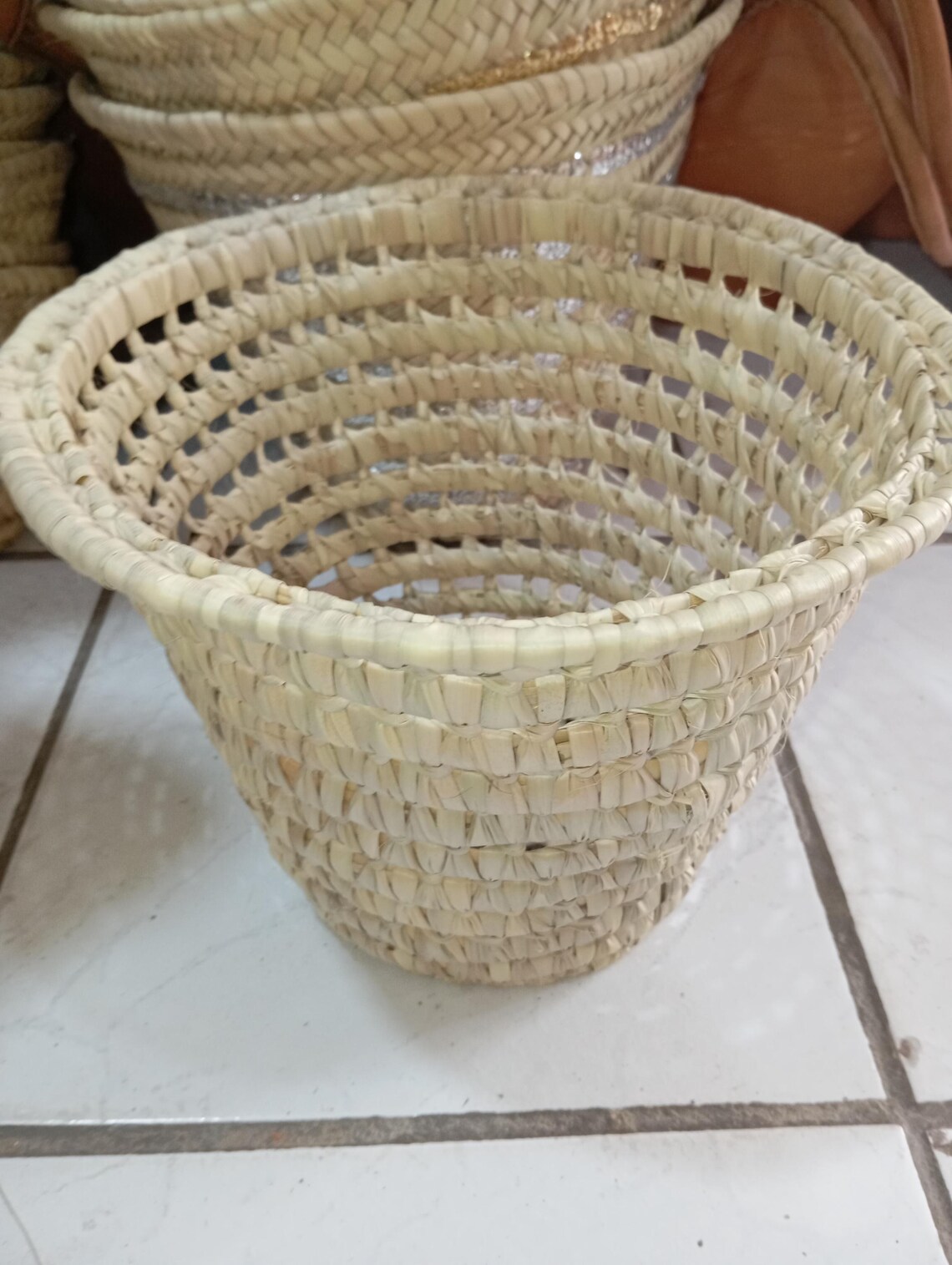 Panier artisanal, tressé main, fibres naturelles, décoration bohème, rangement maison, cache-pot, vannerie artisanale, panier décoratif, déco rustique, organisation, fait main, accessoire maison, objet tressé, intérieur écologique.