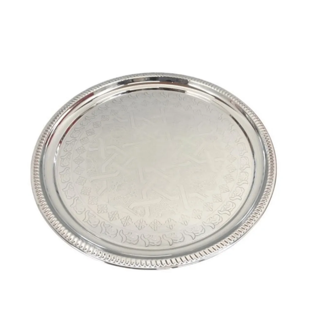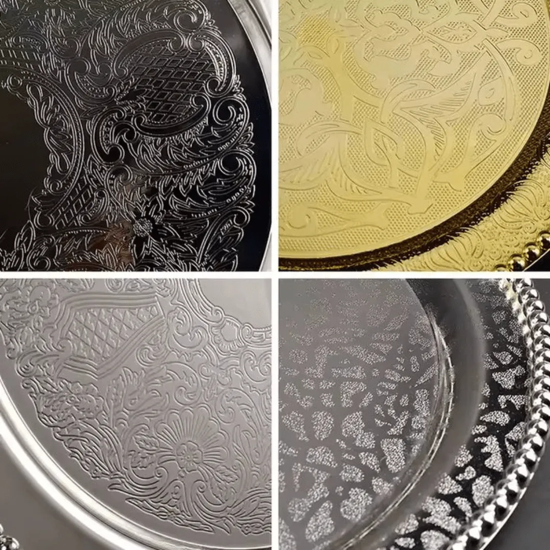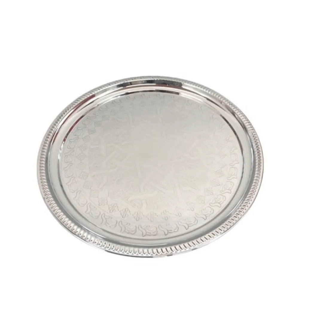 Assiette de présentation en métal décoré, idéale pour les gâteaux, le thé et la décoration.