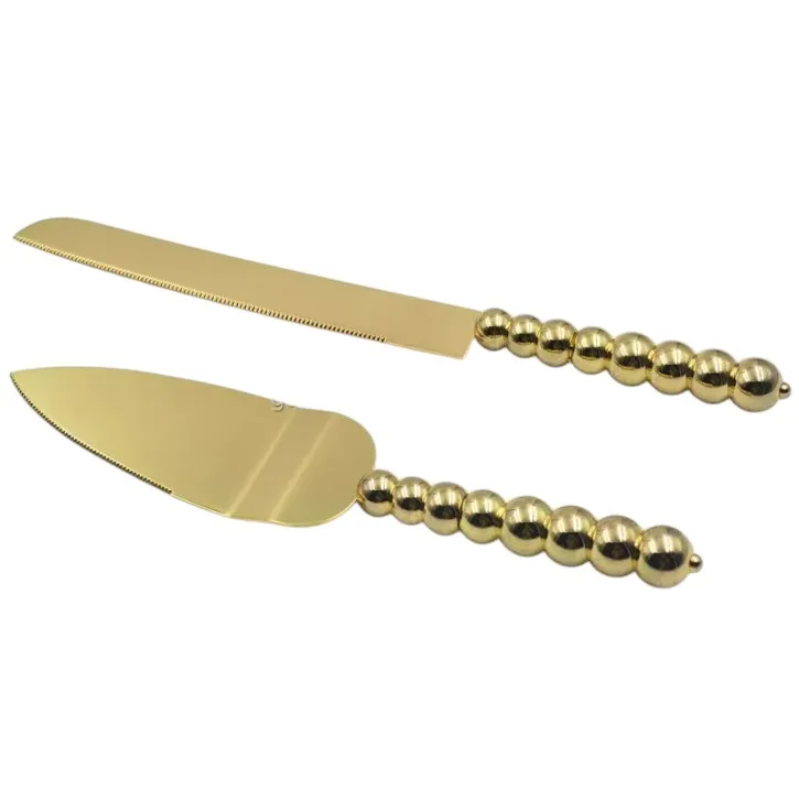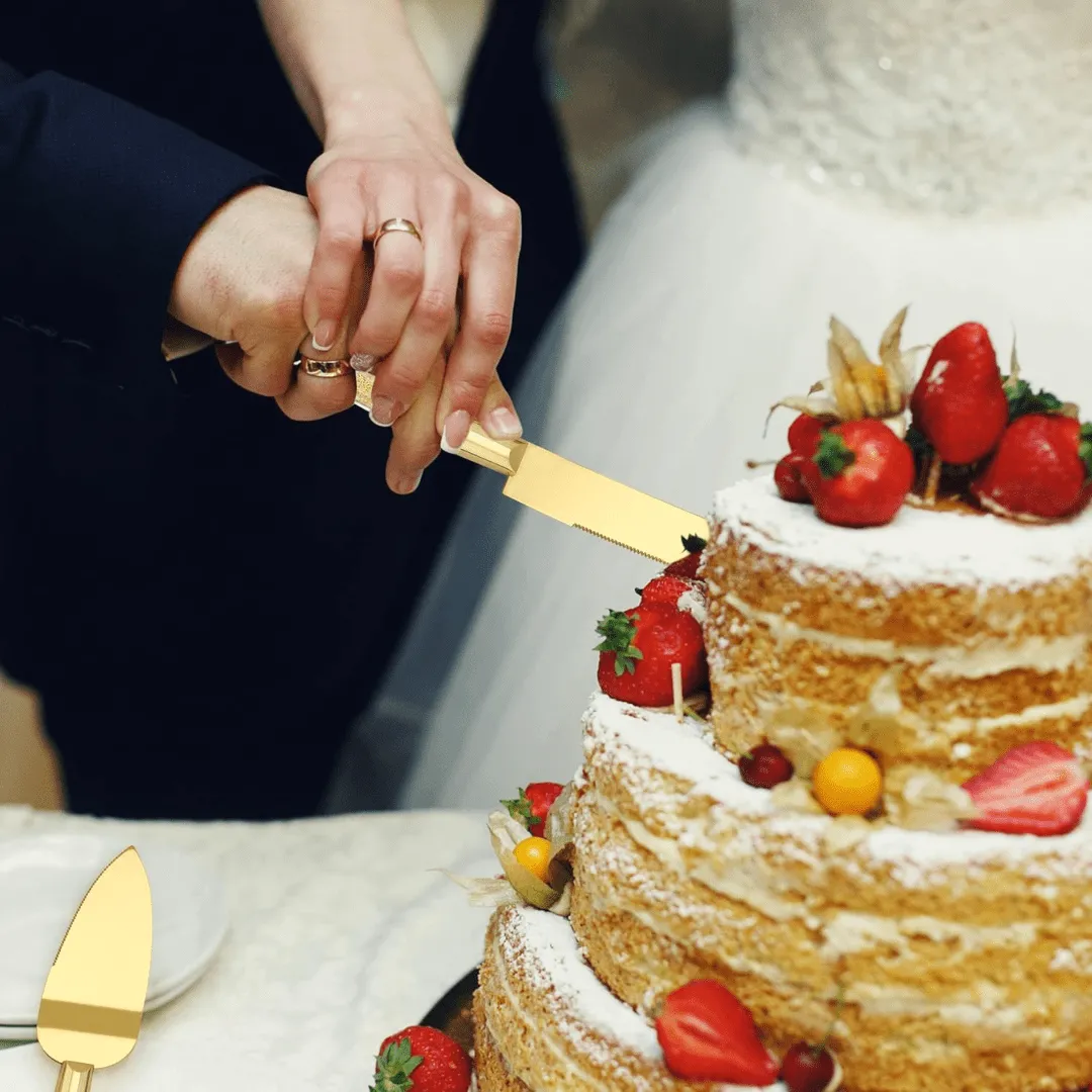 Ensemble de couteaux à gâteaux de mariage avec pelle dorée, alliant élégance et fonctionnalité pour couper et servir le gâteau lors des occasions spéciales comme les mariages et Noël.