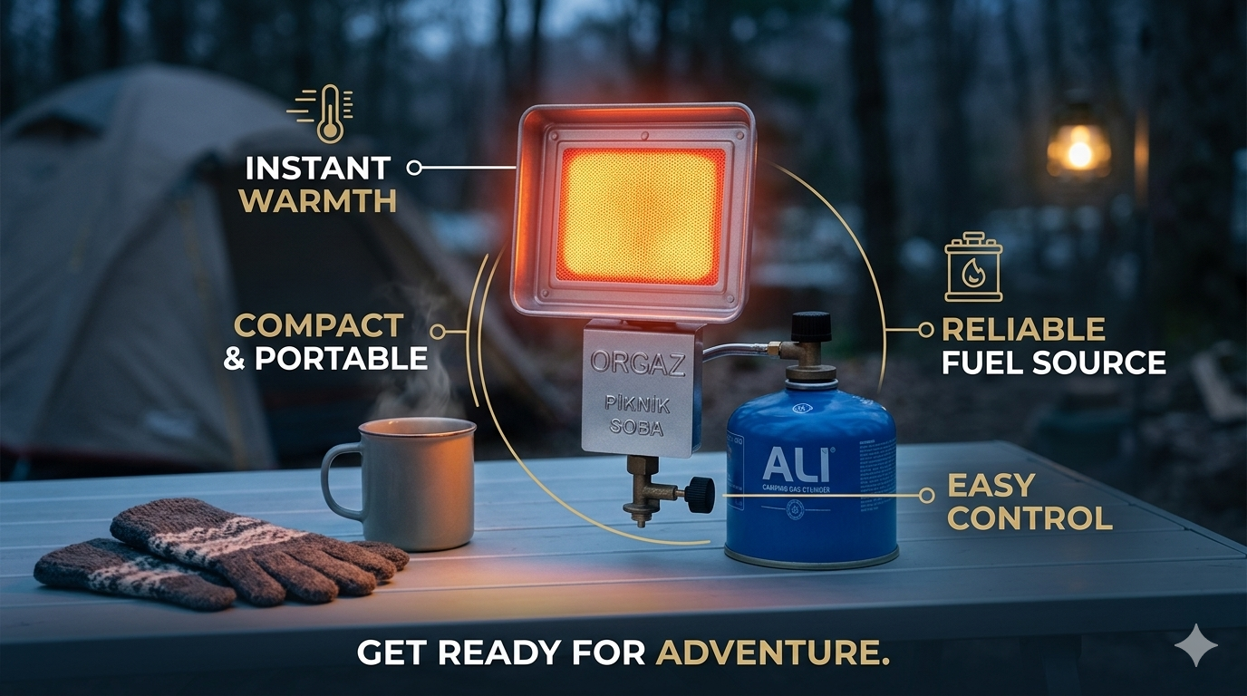 Chauffage portable pour camping, idéal pour se réchauffer en extérieur lors des sorties, voyages ou activités en plein air.