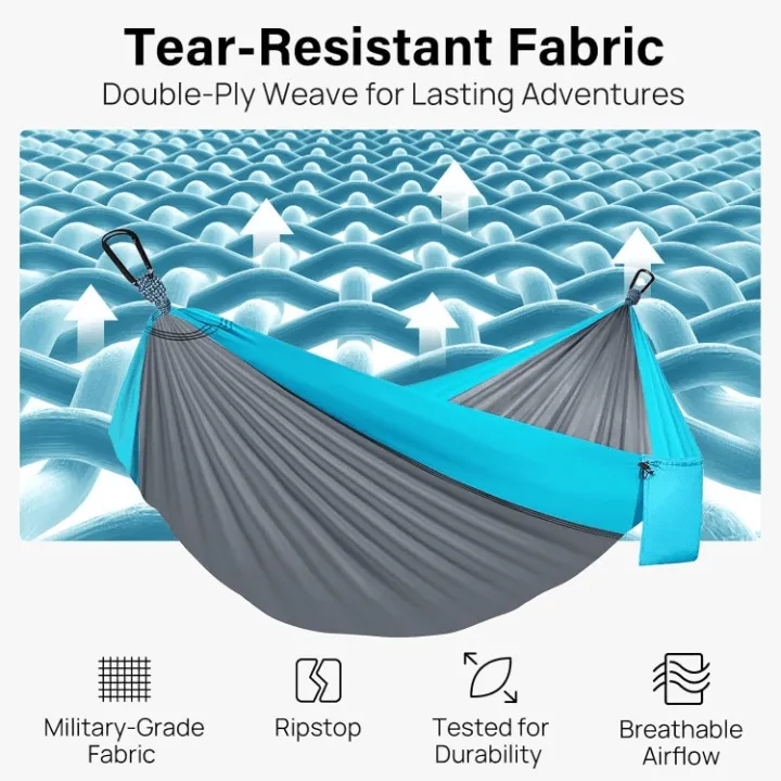 Hamac de camping portable, équipé de sangles pour arbre et d’un sac de transport, parfait pour se détendre en extérieur ou à l’intérieur. Léger et facile à installer, il est idéal pour le camping, les randonnées ou le jardin.