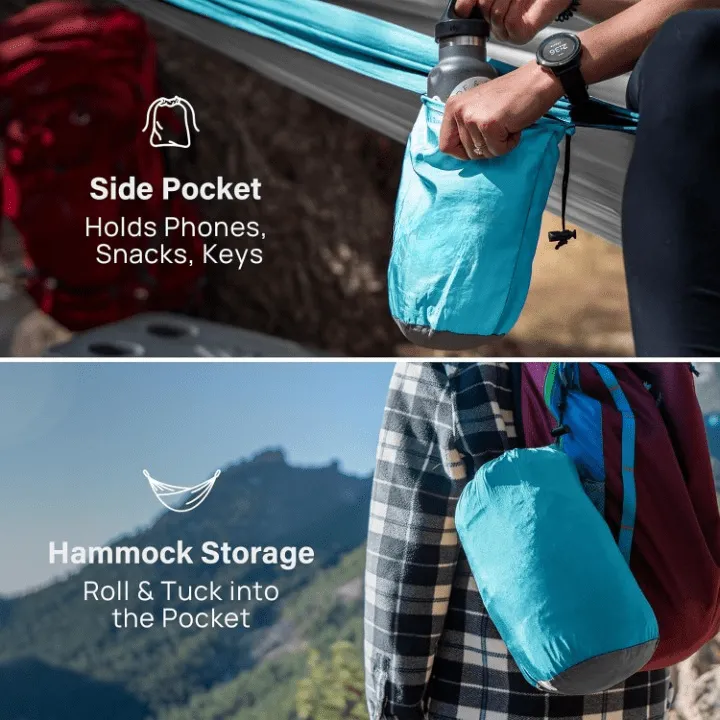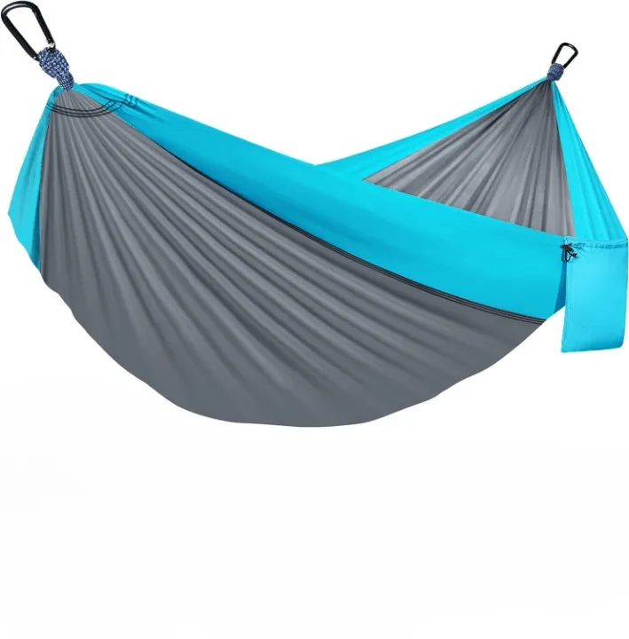 Hamac de camping portable avec sangles et sac de transport, idéal pour extérieur et intérieur.