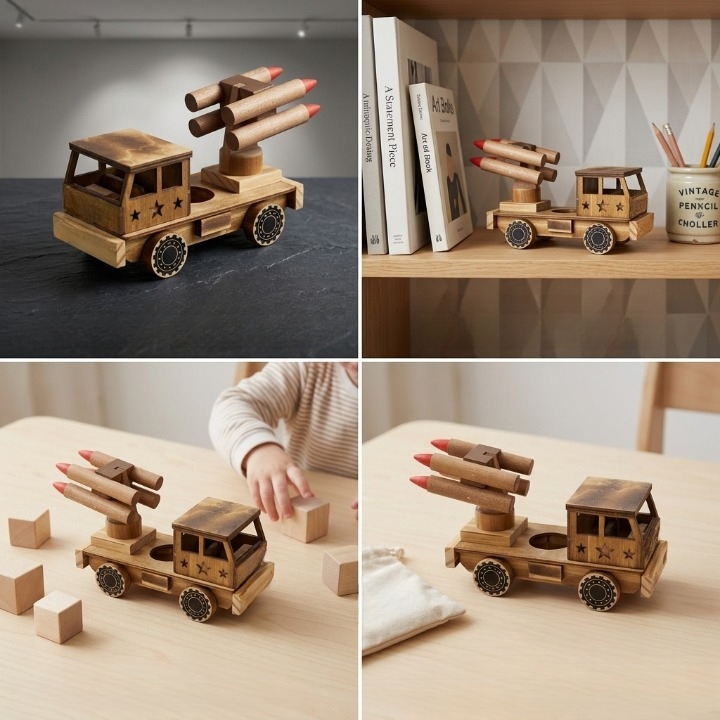 Objet en bois combinant jouet pour enfants et décoration maison avec un design militaire réaliste et décoratif.