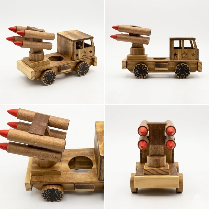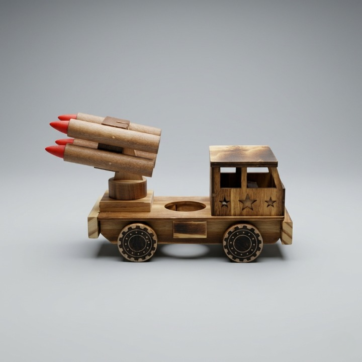 Maquette décorative en bois représentant un véhicule militaire lance-missiles, adaptée comme objet de décoration pour la maison et jouet pour enfants.