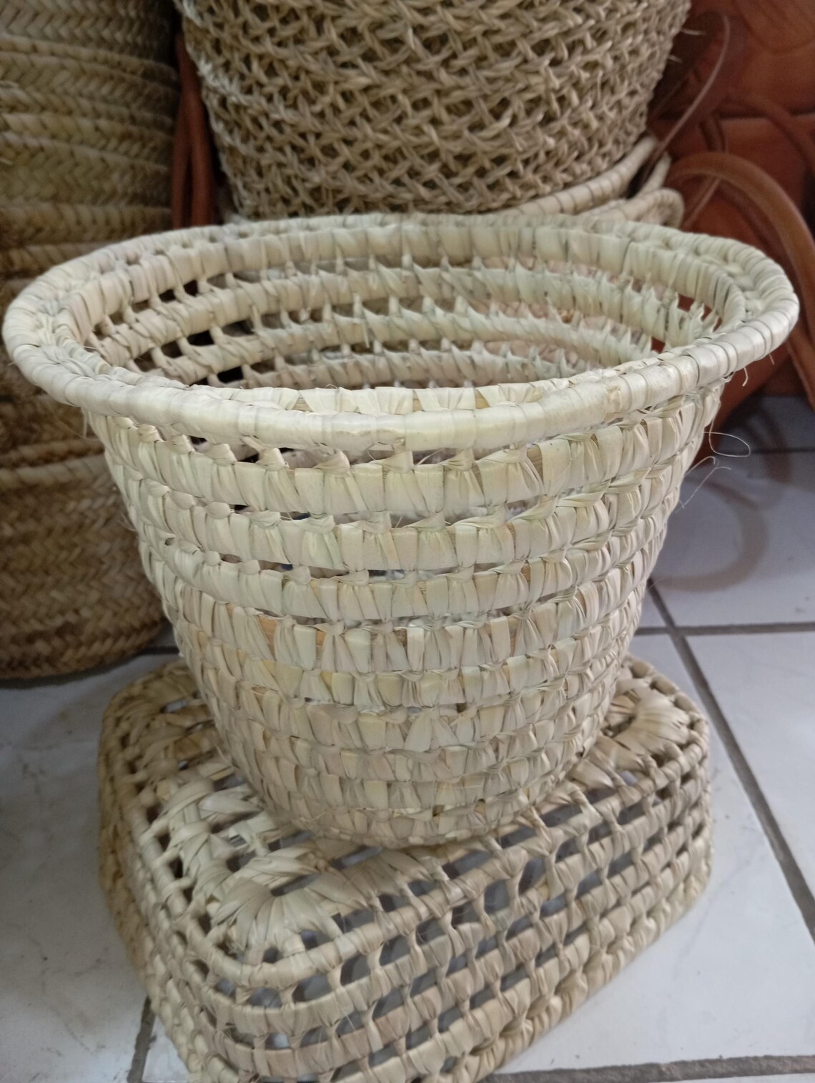 Panier artisanal, tressé main, fibres naturelles, décoration bohème, rangement maison, cache-pot, vannerie artisanale, panier décoratif, déco rustique, organisation, fait main, accessoire maison, objet tressé, intérieur écologique.