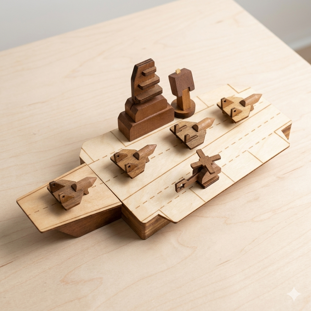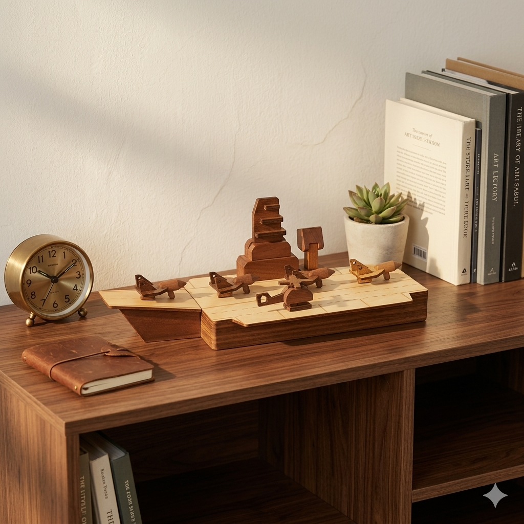 Ensemble en bois représentant une flotte militaire, conçu comme jouet pour enfants et objet décoratif pour la maison ou le bureau, alliant jeu et style décoratif.