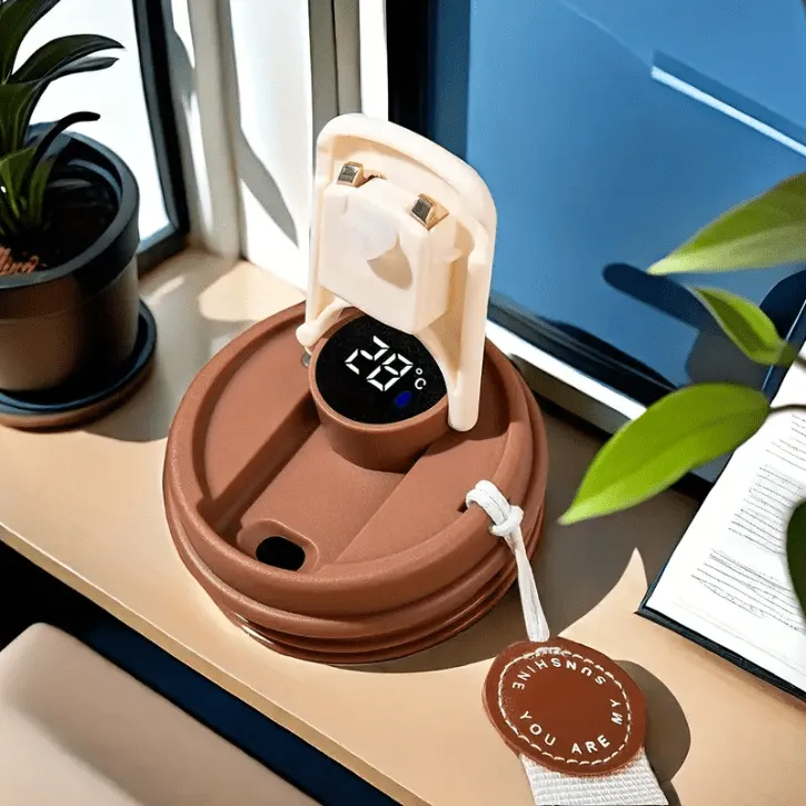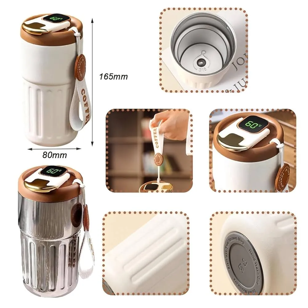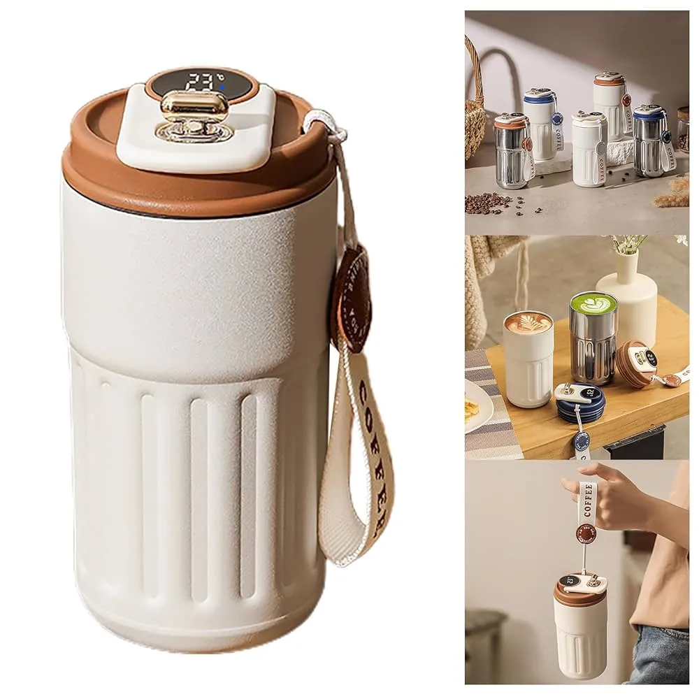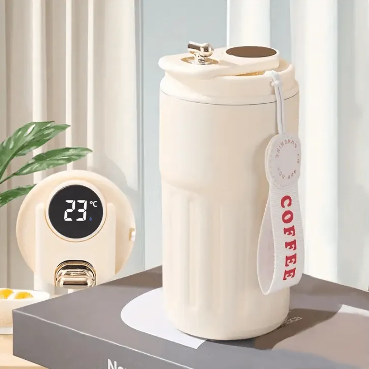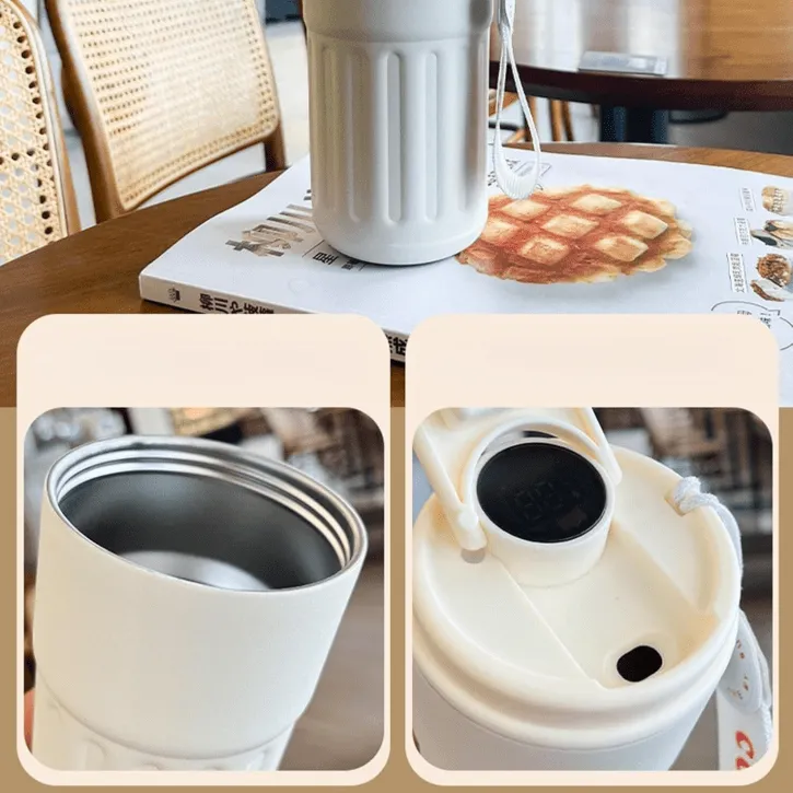 Tasse à café isotherme en acier inoxydable avec affichage digital, conçue avec une double paroi sous vide pour maintenir la température des boissons chaudes ou froides. Équipée d’un couvercle pratique, elle est idéale à emporter au bureau, en voyage ou au sport.